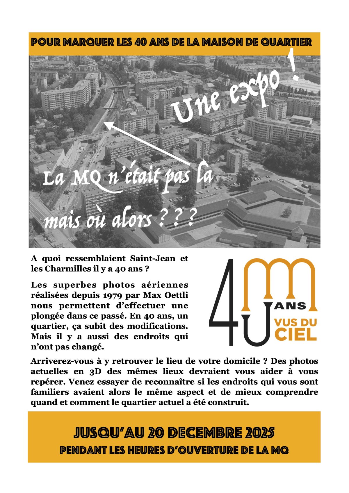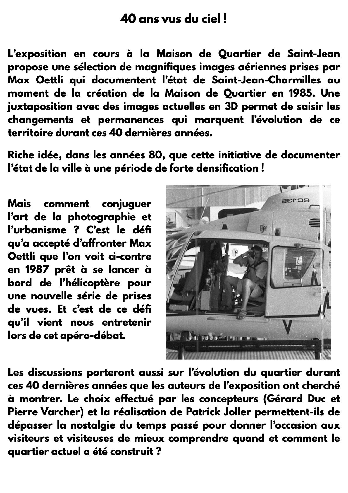 Venez découvrir notre exposition de photos aériennes du quartier et rencontrer celui qui les a prises en 1985. Accueil dès 18h00.