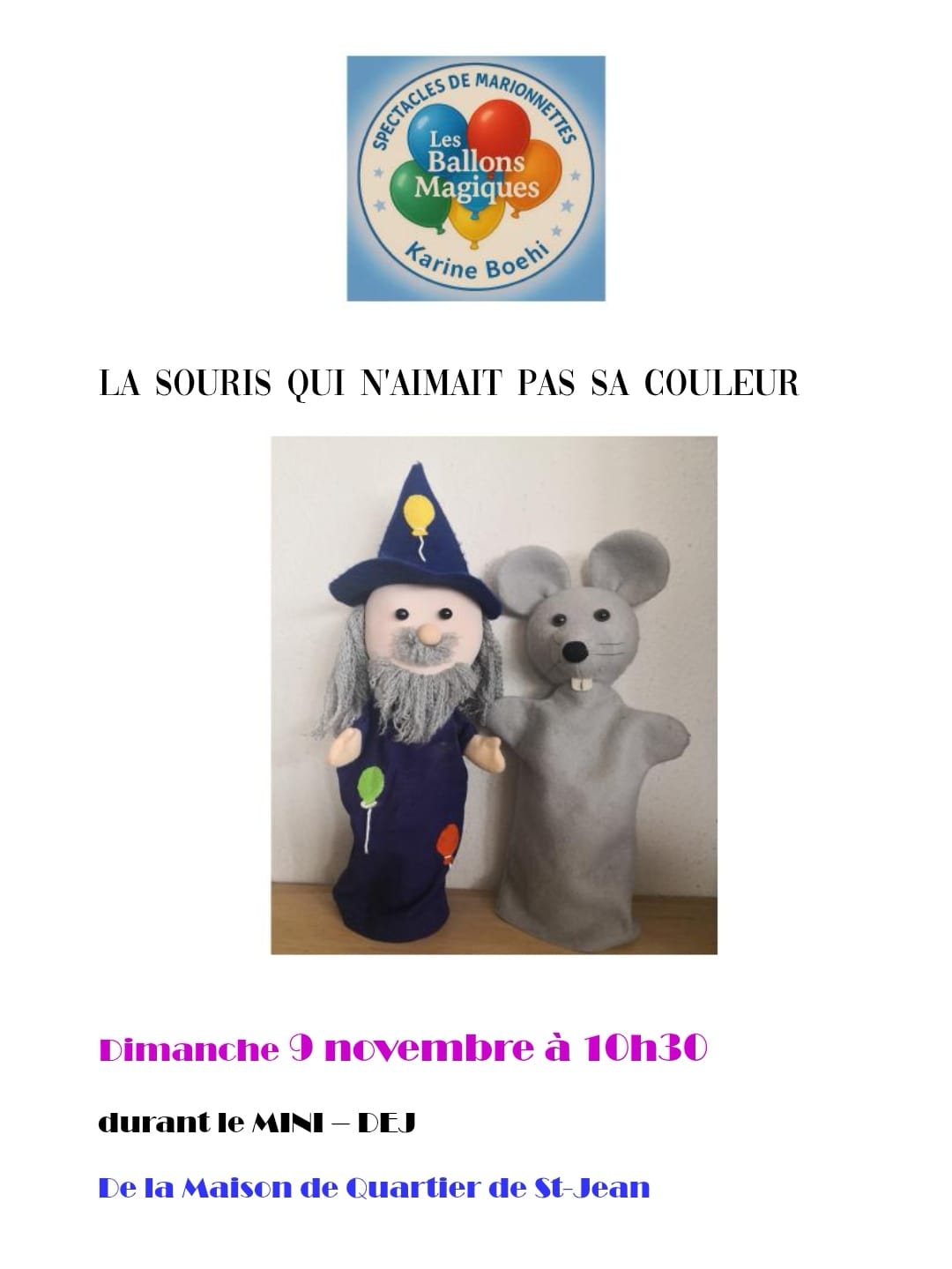 Pour ce Mini-Déj de novembre, nous accueillerons "les ballons magiques" pour le spectacle de Marionnettes "la souris qui n'aimait pas sa couleur".